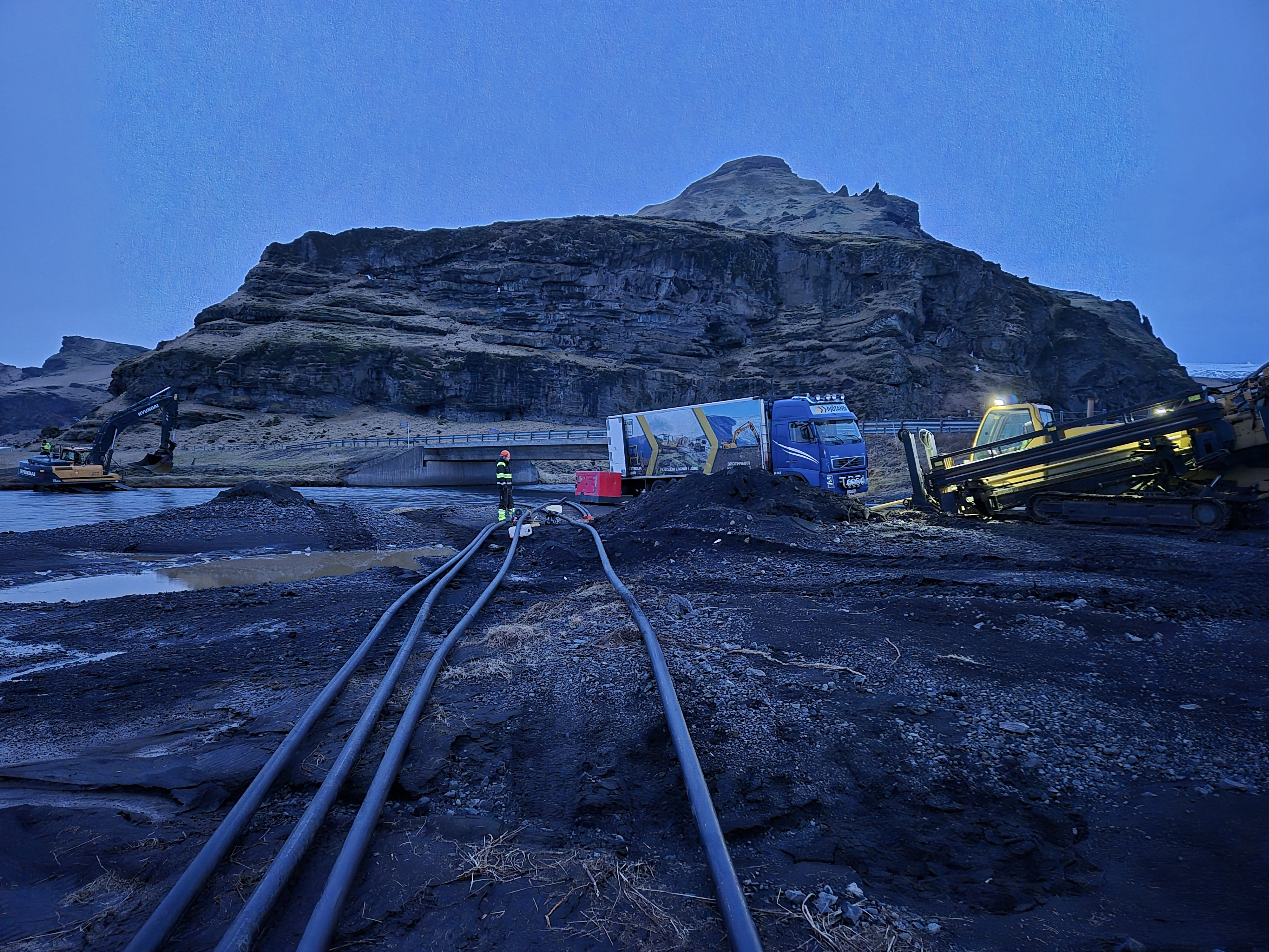 Enn er rafmagn keyrt á varaafli í Vík og Mýrdal eftir að Víkurstrengur bilaði aðfaranótt síðasta sunnudags þar sem hann liggur plægður ofan í Skógá.