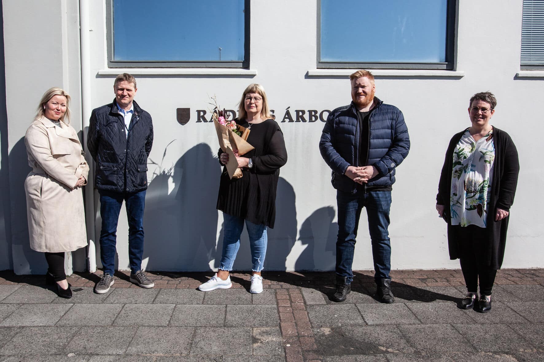 Það voru Gunnar Eysteinn Sigurbjörnsson, fulltrúi fræðslunefndar og Hilmar Björgvinsson, skólastjóri Stekkjaskóla sem veittu verðlaunin í blíðskaparveðri, auk Ástrósar Rúnar, aðstoðarskólastjóra Stekkjaskóla og Önnu Ingadóttur deildarstjóra skólaþjónustu.