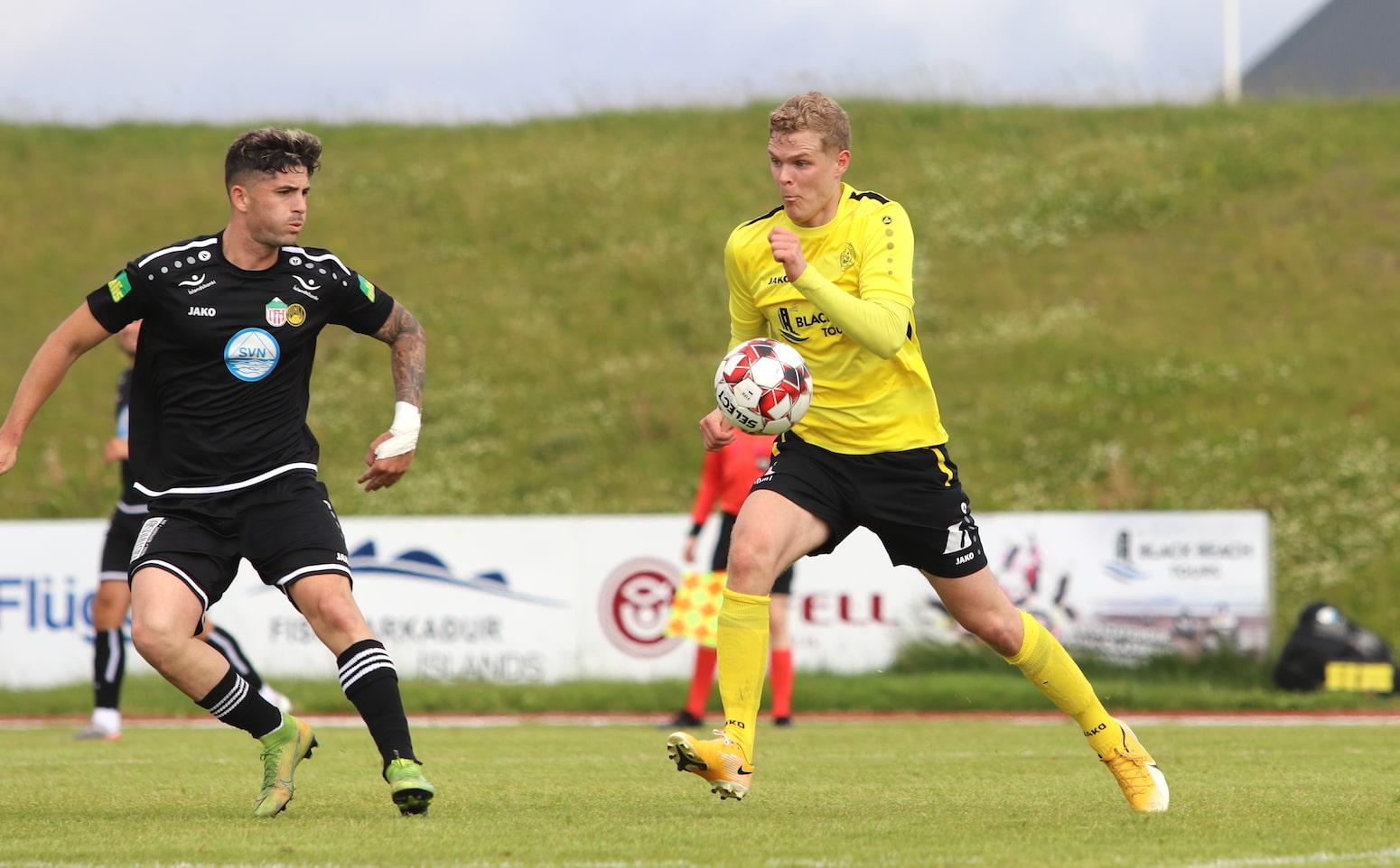 Ægismenn sóttu nokkuð stíft með þéttan vind í bakið í fyrri hálfleik en tókst ekki að skora og því var það skellur fyrir þá að gestirnir komust yfir með enn einu skallamarkinu eftir hornspyrnu á lokamínútu fyrri hálfleiks.