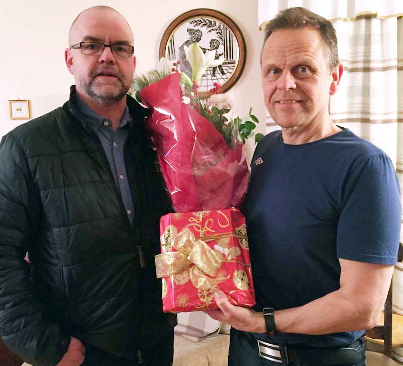 Kjartan Björnsson, forseti bæjarstjórnar og formaður íþrótta- og menningarnefndar, færði Þóri gjöfina á heimili Hergeirs Kristgeirssonar, föður Þóris, í árlegu fjölskylduboði á Selfossi í kvöld.