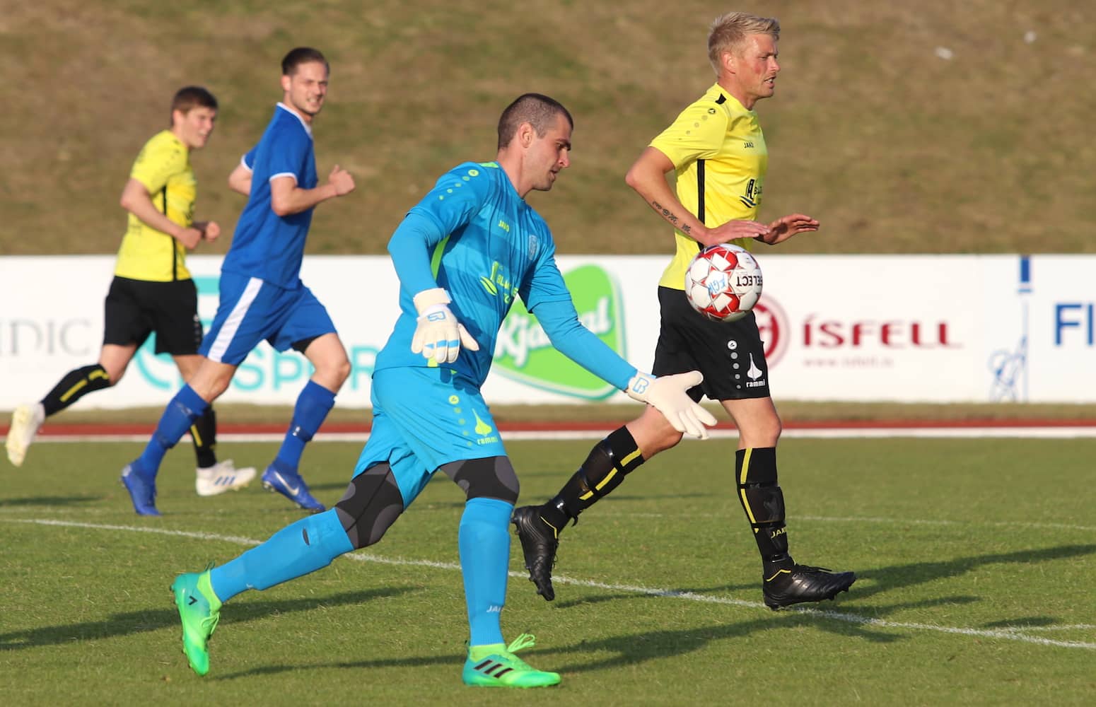 Það var rok og bleyta á Blönduósi í dag og hafði vindurinn talsverð áhrif á leikinn.