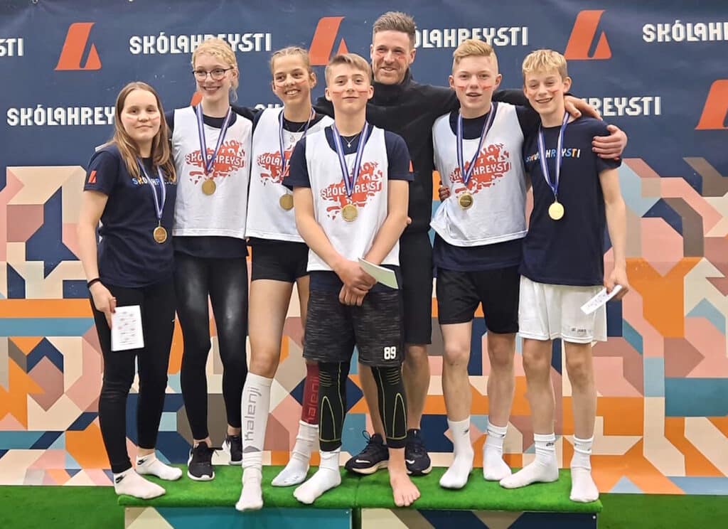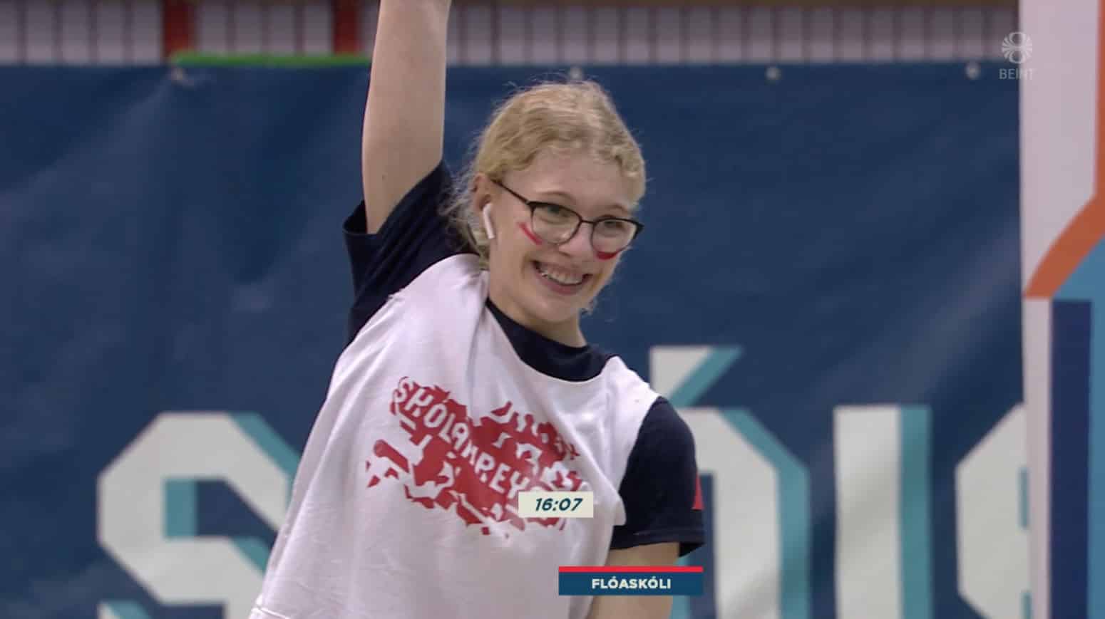 Ekki nóg með það að Erlín hafi slegið í gegn í dag heldur stóð Flóaskóli sig frábærlega í keppninni og sigraði sinn riðil með talsverðum yfirburðum og er því kominn í úrslit. Flóaskóli teflir fram sama liði og í fyrra og liðið er greinilega reynslunni ríkara því skólinn sigraði einnig í hraðaþrautinni í dag. Auk Erlínar skipa liðið þau Sigurjón Reynisson sem keppti í upphífingum og dýfum og Hanna Dóra Höskuldsdóttir og Viðar Hrafn Victorsson sem kepptu í hraðaþrautinni. Varamenn eru Þórunn Ólafsdóttir og Auðunn Ingi Davíðsson.