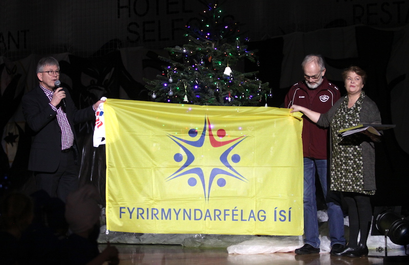 Það var Hafsteinn Pálsson, stjórnarmaður ÍSÍ, sem afhenti Þóru Þórarinsdóttur, formanni fimleikadeildar, fána fyrirmyndarfélagsins.