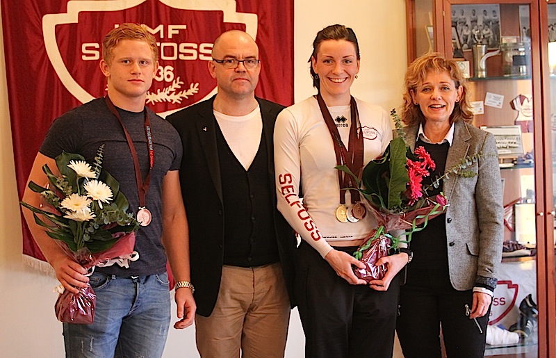 Ungmennafélag Selfoss og Sveitarfélagið Árborg heiðruðu í kvöld Fjólu Signý Hannesdóttur og Egil Blöndal en þau unnu bæði til verðlauna á Smáþjóðaleikunum í sumar.