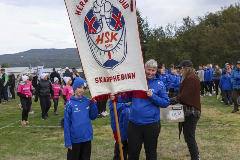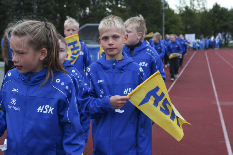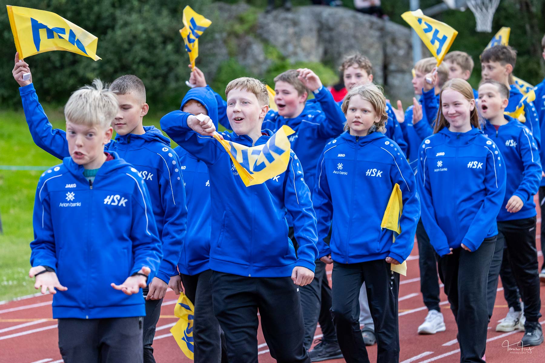 Það var glæsilegur HSK hópurinn sem gekk inn á völlinn á setningarhátíð mótsins, en allir keppendur sambandsins fengu að gjöf bláa HSK treyju merkta HSK og Arion banka. Bankinn er aðalstyrktaraðili HSK og samstarfið ein aðalforsenda þess að hægt sé að afhenda treyjuna endurgjaldslaust.