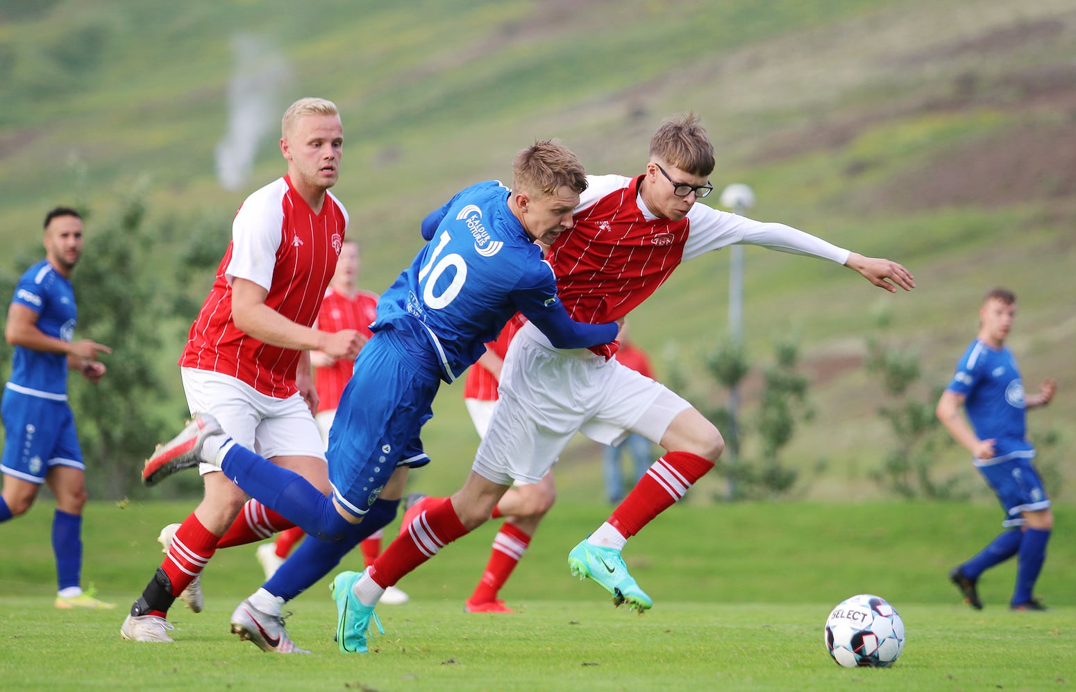 Staðan var 2-1 í hálfleik og bæði lið þreifuðu fyrir sér í upphafi seinni hálfleiks án þess að skora. Síðasta hálftímann tóku Hvergerðingar hins vegar yfir og allar flóðgáttir opnuðust. Atli Þór Jónasson skoraði úr aukaspyrnu á 62. mínútu og strax í kjölfarið komu mörk frá Kristni Ásgeir Þorbergssyni og annað frá Bjarka Rúnari.