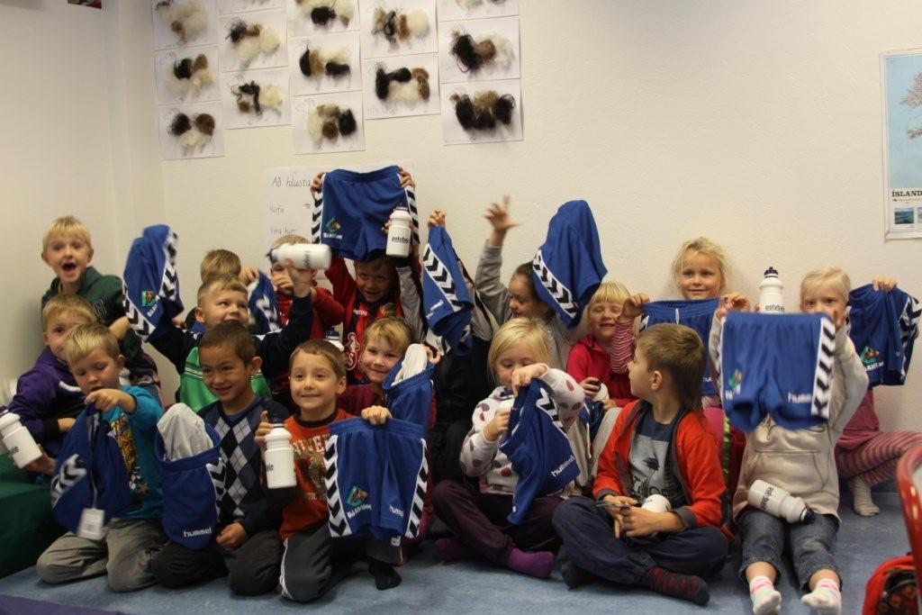 Þau voru glöð í bragði krakkarnir sem tóku við gjöfunum í vikunni, hæst ánægð með lífið. Nú ættu allir að geta spriklað í leikfimi og öðrum íþróttum og fengið sér vatnssopa á eftir.