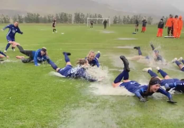 Leikurinn hófst kl. 15 í gær en Grýluvöllur í Hveragerði var gjörsamlega á floti í úrhellisrigningunni þannig að dómarinn ákvað að stöðva leikinn á átjándu mínútu. Þá var staðan 0-1 fyrir FHL.