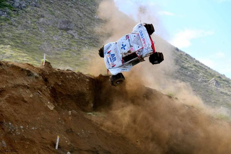 „Ég setti bara hendurnar upp og fagnaði og svo keyrði ég bara bílinn. Hann virtist ekki vera neitt mikið skemmdur en er það aðeins. Það þarf aðeins að klappa honum. Hann fékk svolítið högg á hægra afturhornið. Það bognaði afturhluti veltibúrsins sem við þurfum að laga, samt ekki aðal boginn, heldur bara rör sem halda vatnskassa og bensíntanki og svona og við lögum það kannski svona á einni viku,“ segir Haukur.