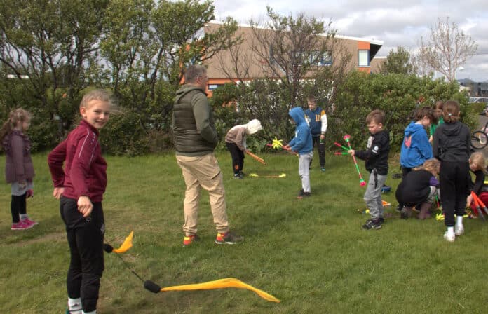 Eftir hádegi mætti yngri kynslóðin í garðinn. Hópurinn taldi um 30 krakka á aldrinum 6-9 ára sem flest voru á leikjanámskeiðum í bænum. Krökkunum var skipt á fjórar ólíkar stöðvar sem flestar byggðust á leikjum en svo var ein sirkusstöð. Eftir að krakkarnir höfðu farið á allar stöðvar mætti Blossi, lukkudýr ÍSÍ á svæðið en hann vekur alltaf lukku. Yngstu krakkarnir fengu einnig grillaðar pylsur og ís í lokin.