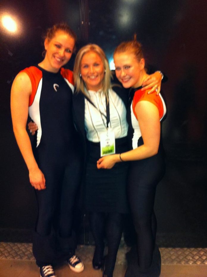 Báðar hafa þær keppt fyrir fimleikadeild Umf. Selfoss og koma úr fimleikaakademíu félagsins. Rakel er frá Árbæjarhjáleigu í Holtum en Helga frá Hveragerði. Þær stunda nám við Ollerup lýðháskólann í Danmörku sem teflir fram sterku liði núverandi og fyrrverandi nemenda. Þær hafa stundað nám við skólann síðan í haust og komust strax í lið skólans sem þegar hafði tryggt sér þátttökurétt á NM.