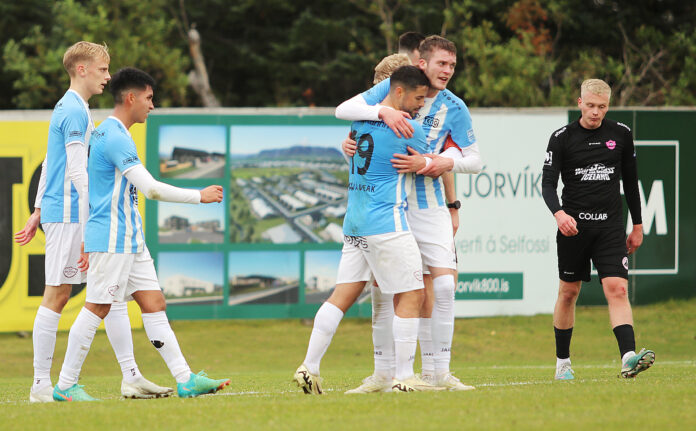 Selfoss komst yfir strax á 6. mínútu þegar Gonzalo Zamorano veiddi boltann upp í vítateignum og hamraði hann í netið. Tuttugu mínútum síðar tvöfaldaði Alexander Clive Vokes muninn með gullfallegri vippu yfir markvörð gestanna eftir stoðsendingu frá Aroni Fannari Birgissyni.