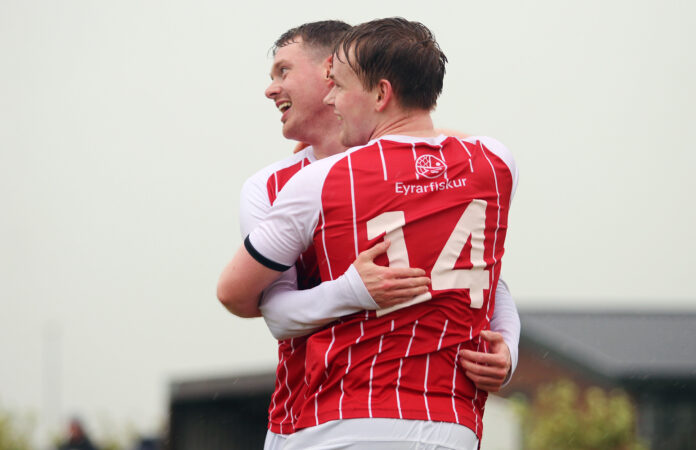 Hafþór bætti sjötta marki Stokkseyringa við í upphafi seinni hálfleiks en þá var komið að Reynismönnum, sem höfðu vindinn í bakið í seinni hálfleiknum. Þeir minnkuðu muninn í 6-3 en Hafþór átti lokaorðið fyrir Stokkseyri, fjórum mínútum fyrir leikslok þegar hann innsiglaði þrennu sína og tryggði Stokkseyringum 7-3 sigur.