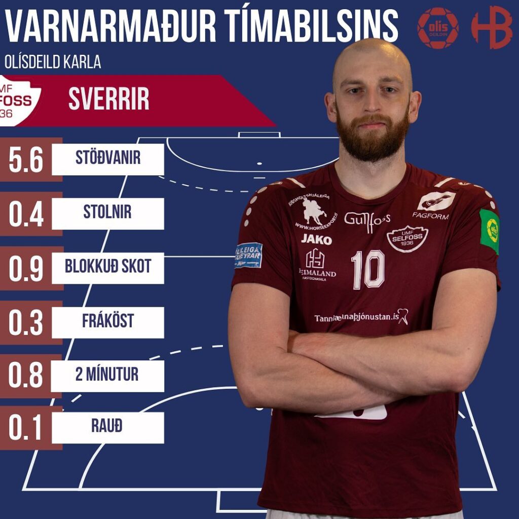 Sverrir Pálsson, leikmaður Selfoss, er besti varnarmaður Olísdeildar karla í handbolta í nýlokinni deildarkeppni, miðað við tölfræði HBStatz.