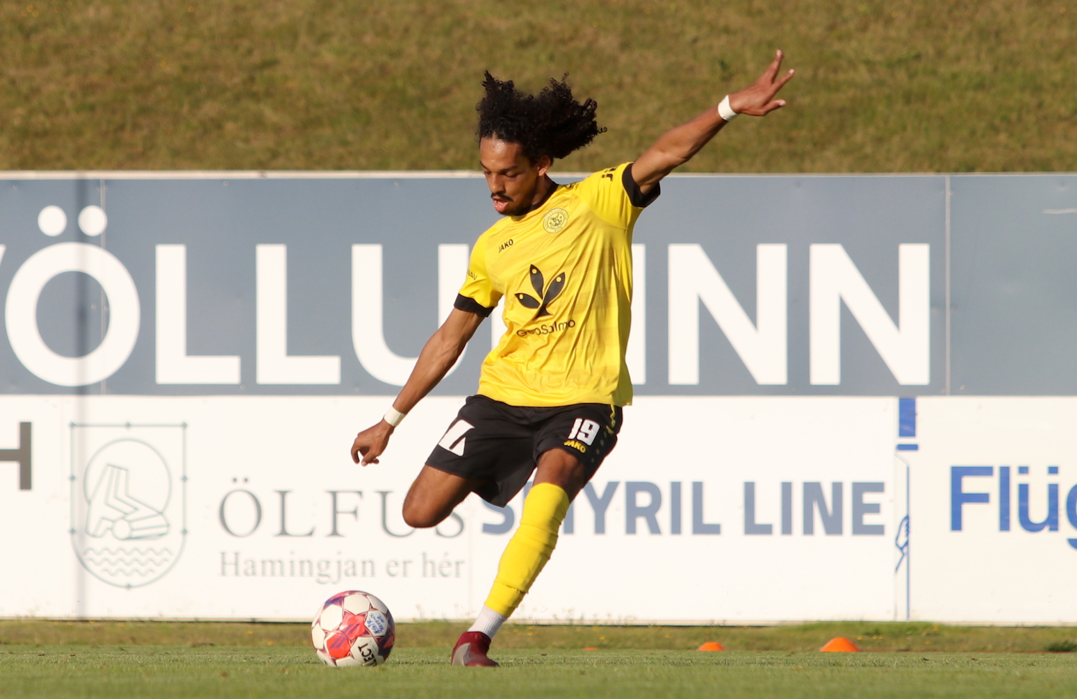 Aldrei þessu vant var gjóla í Þorlákshöfn í dag og gestirnir léku með vindinn í bakið í fyrri hálfleik. Gróttumenn komust yfir á 20. mínútu og bættu öðru marki við skömmu fyrir hálfleik, 0-2 í leikhléi.