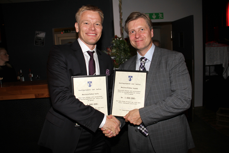 Bæjaryfirvöld í Árborg færðu knattspyrnudeild Umf. Selfoss tvær milljónir króna að gjöf á laugardag í tilefni þess að bæði meistaraflokkslið deildarinnar náðu þeim árangri að komast í hóp þeirra bestu á næsta ári.