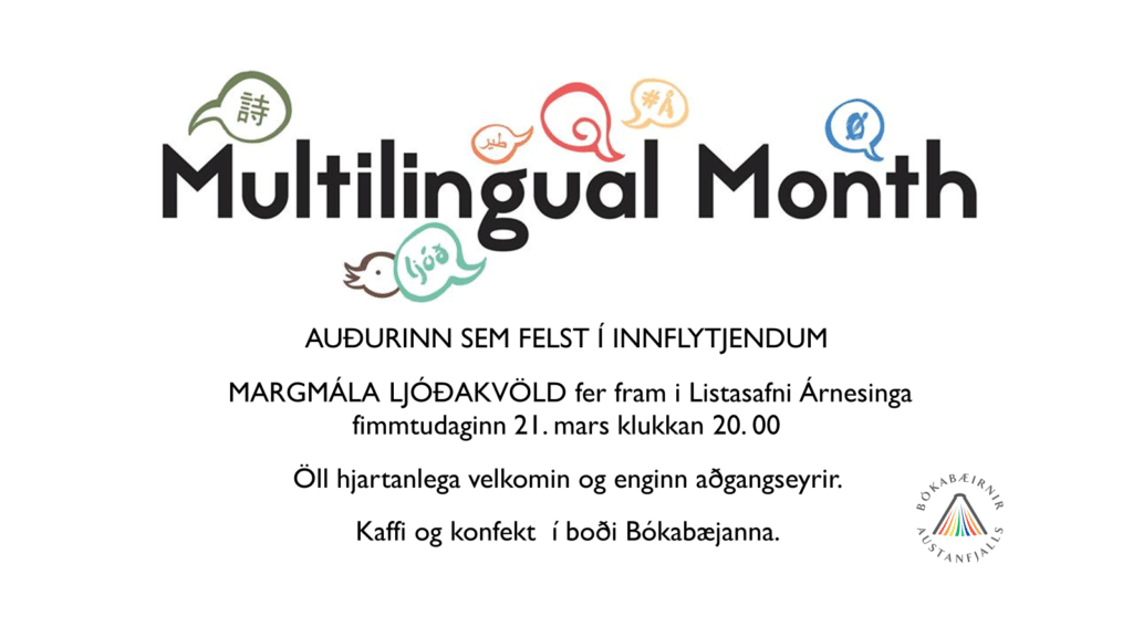 Í ljóðaflutningnum flytur Bridget Ýr McEvoy ljóð á ensku og Sveinn Magnússon les íslenska þýðingu ljóðsins. Agnetha Thomsen flytur ljóð á færeysku. Eduardo Perez Baca og Ivan Fernández flytja ljóð á spænsku ásamt Alexöndru Huaman frá Perú, Ruyi Zhao flytur ljóð á kínversku, Natalía Drumeva flytur ljóð á búlgörsku og Alina Elena Floristeanu flytur ljóð á rúmensku. Jón Özur Snorrason reynir að svara spurningunni: Hvað er ljóð? Jónína Sigurjónsdóttir frá Bókabæjunum heldur utan um dagskrána.
