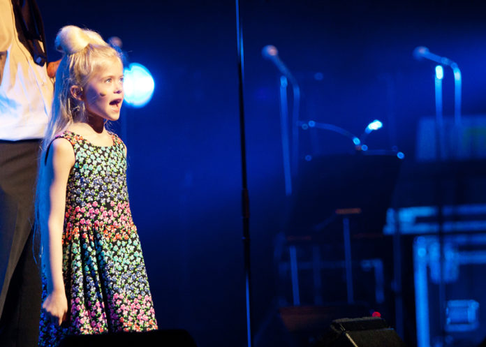 Agla Bríet Gísladóttir, tæplega níu ára stelpa frá Selfossi, söng með Stuðmönnum þegar þeir voru með allt á hreinu í Hörpu um síðustu helgi.