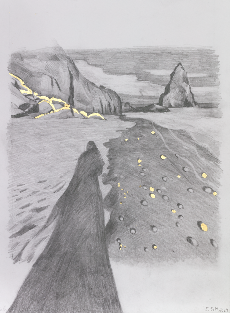Erla S. Haraldsdóttir sýnir gvassverk auk blýantsteikninga með blaðgulli og málaðra skúlptúra úr náttúruefnum og eru verkin unnin á árabilinu 2021 til 2024.