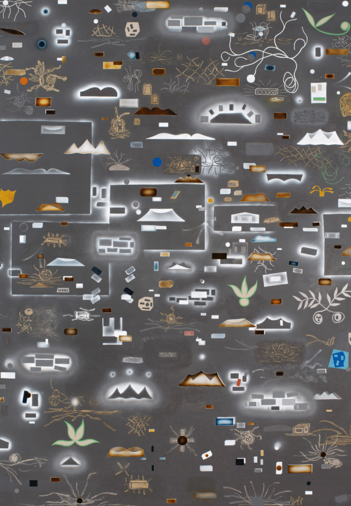 Málverk Kristins Más Pálmasonar eru stór að stærðum og sprúðlandi af lífi, nánast á hreyfingu og draga okkur til sín líkt og hvirfilbylur, svo mikið er að gerast á myndfletinum. Okkur birtast þar ýmis rúmfræðileg form, birtingarmyndir ýmiss tákna og vísanir í táknfræði fyrri tíma og samtímans, hlutbundin og óhlutbundin teikning, sums staðar handskrift og annars staðar náttúruleg form.