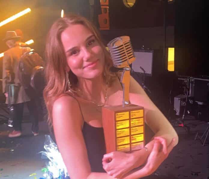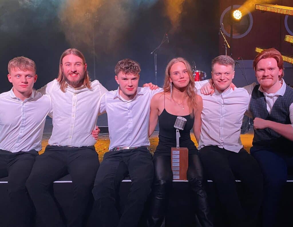 Söngkonan unga frá Þorlákshöfn var ekki ein á sviðinu því frábær hljómsveit úr fjölbrautaskólanum lék undir hjá henni í kvöld, eins og í undankeppninni.