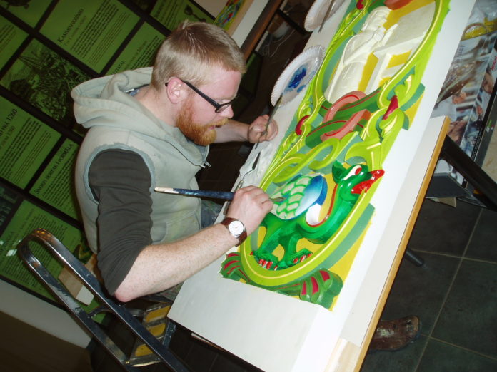 Þar er Hallur Karl að mála vígásana sem fyrirhugað er að verði í anddyri sýningarinnar um Snorra Sturluson, sem opnuð verður í sumar í Reykholti.