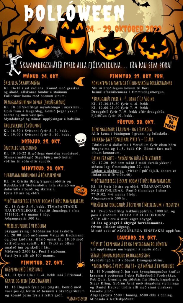 Skammdegishátíðin Þollóween hefst í dag í Þorlákshöfn með þéttri dagskrá út vikuna. Í dagskránni í ár eru eins og áður viðburðir fyrir alla aldurshópa og fastir liðir eins og skelfilega skrautsmiðjan þar sem bæjarbúar hittast til að skera út grasker og fleira, skelfileg sundstund, barnaviðburðurinn grafir og bein og auðvitað grikk eða gott á sínum stað.