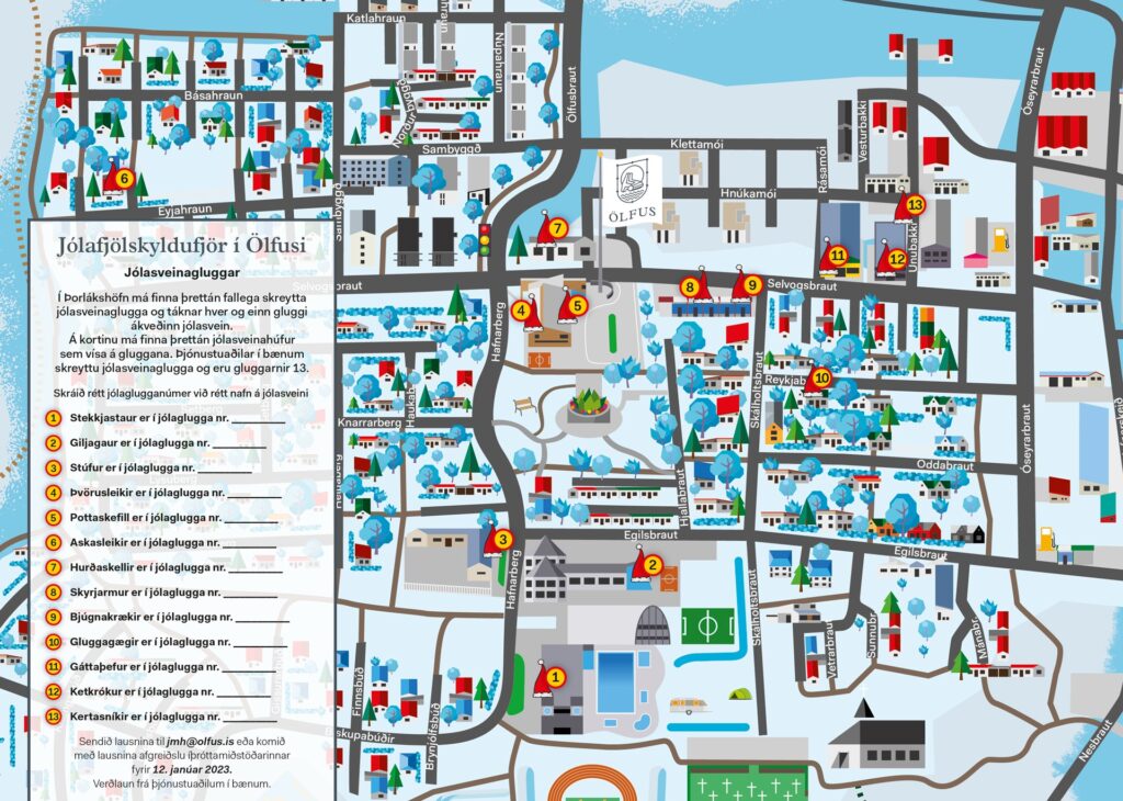 Þjónustuaðilar í bænum skreyttu jólasveinagluggana og á kortinu hér fyrir neðan má sjá hvar má finna jólasveinaglugga eftir númerum. Lausnina á svo að senda á jmh@olfus.is eða koma með hana bæjarskrifstofuna fyrir 12. janúar 2024.
