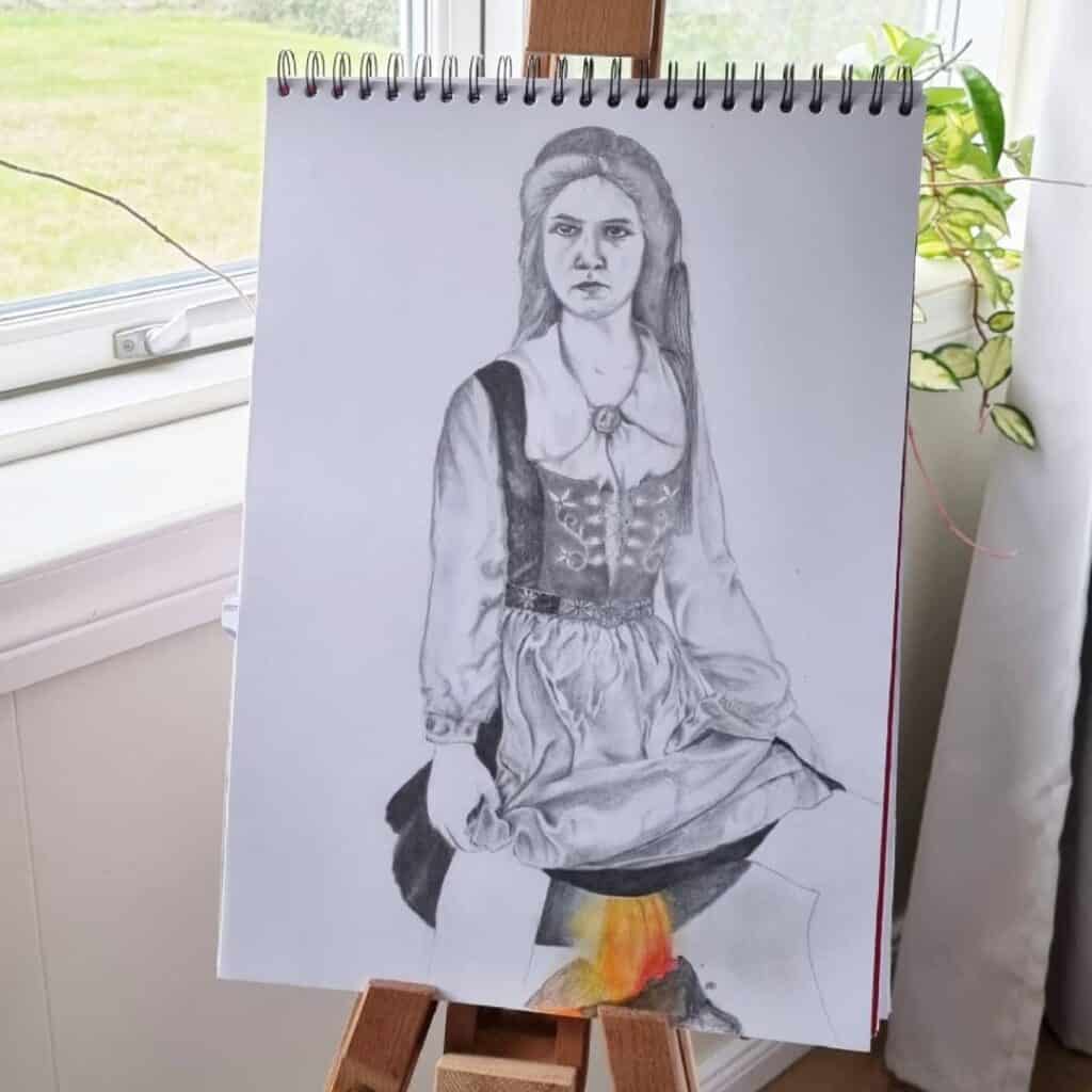 „Það er mjög misjafnt hvað ég er lengi að teikna hverja mynd en þessar sem fólk fær að sjá, taka mig marga daga, upp í vikur að gera. Myndir sem ég geri á skemmri tíma fær bara skúffan mín að sjá. Lang mest nota ég bara ódýra blýanta. Ef ég nota liti þá eru það vatnslitatrélitir frá Faber-Castell. Ég vil ekki eiga of mikið af allskonar dóti, áskorunin er að nota bara það sem ég á til.“