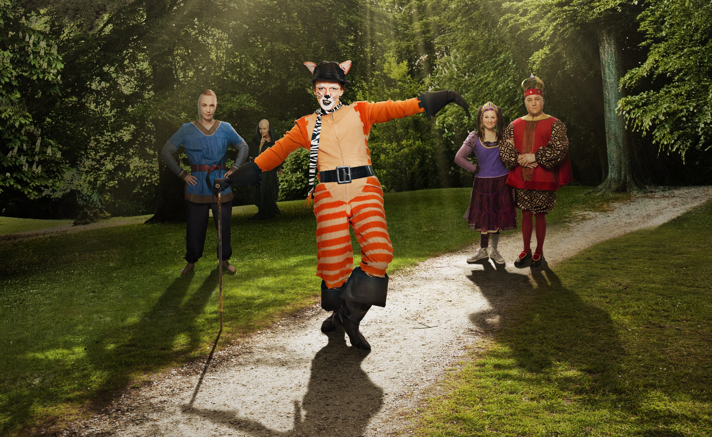 Stígvélaða köttinn þekkja flestir en auk hans eru ævintýrin um Nýju fötin keisarans og Birnina þrjá fléttuð inn í söguþráðinn. Alls eru sex leikarar í sýningunni sem skipta á milli sín þrettán hlutverkum. Þá er flutt lifandi tónlist, söngur og dans og því nóg um að vera.