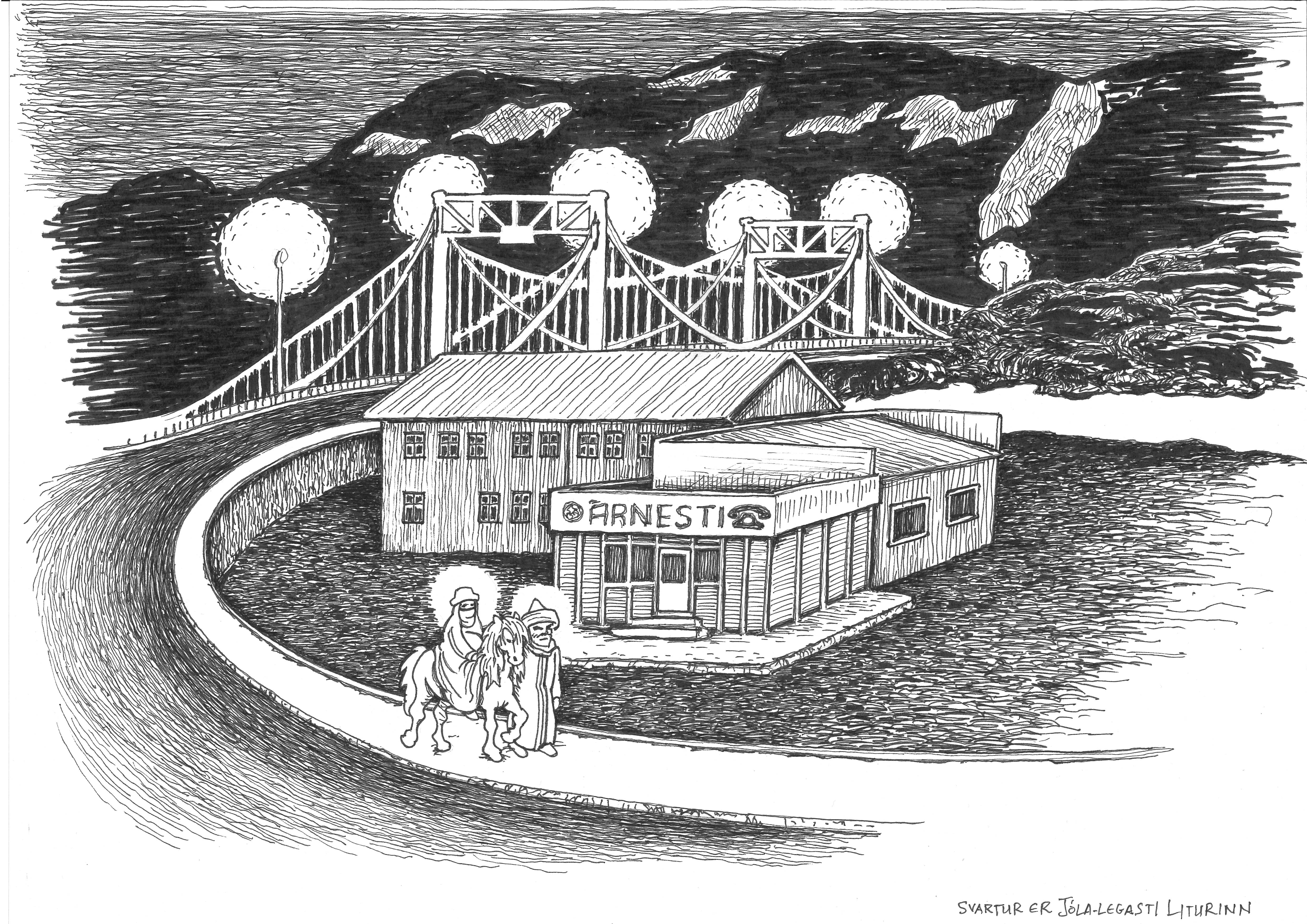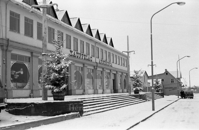 Annars lét parið með hestinn ekki trufla sig þá fáu bíla sem fóru um götur bæjarins. Þau gengu í hægðum sínum í snjófjúki undir jólastjörnu fram hjá Kaupfélaginu og beygðu upp Tryggvagötu.