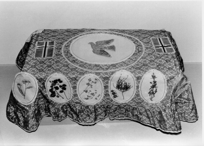 Auk veggteppanna er á sýningunni mjög merkur gripur, „klæðið fljúgandi“ eða líkkistuklæði Ingibjargar Jónsdóttur sem fæddist að Gaulverjabæ árið 1875 en dó í Suður-Kaliforníu 1964.