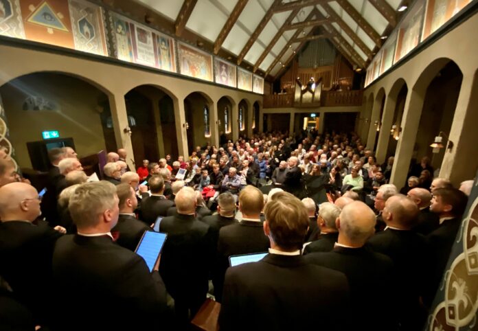 Það var mögnuð stund þegar Karlakór Selfoss hélt seinni jólatónleika sína fyrir rúmlega troðfullri Selfosskirkju í gærkvöldi en á fjórða hundrað manns mættu á tónleikana.
