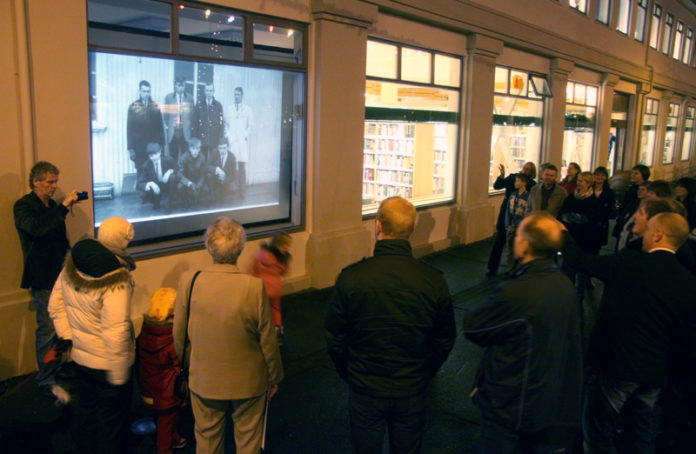 Afmælissýning Héraðsskjalasafns Árnesinga hefur vakið mikla athygli en hún er sýnd á risatjaldi í glugga safnsins við Austurveg á Selfossi.