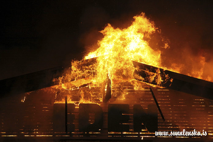 Útkallið barst slökkviliðinu í Hveragerði kl. 0:10 og þá var mikill eldur í veitingahlutanum. Tíu mínútum síðar var eldurinn farinn að festast í verslunarhlutanum. Eldurinn magnaðist gríðarlega hratt eftir það og sýnir klukka í myndavél sunnlenska.is að verslunar og gróðurhlutinn varð alelda á rúmlega einni mínútu.