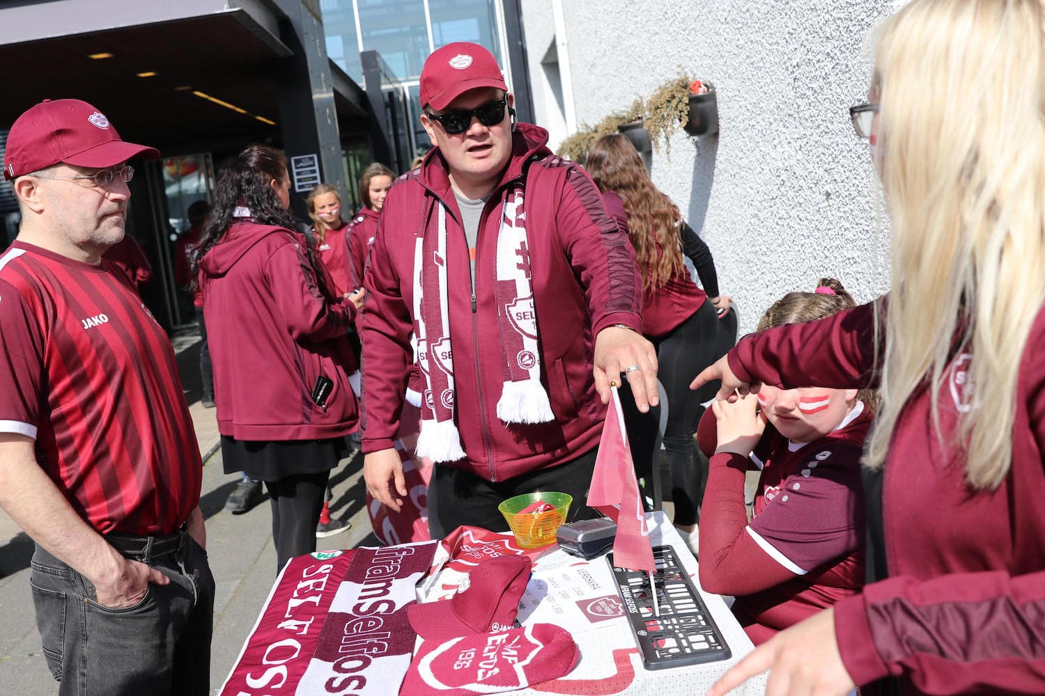 Stuðningsmenn Selfoss hittust fyrir utan Hótel Selfoss klukkan eitt í dag til þess að hita upp fyrir leikinn, grilla og hlusta á góða tónlist. Það var létt yfir fólki og menn eru bjartsýnir á sigur í leiknum og núna klukkan þrjú ætla stuðningsmennirnir að fylla nokkrar rútur frá Guðmundi Tyrfingssyni og bruna á Laugardalsvöllinn.